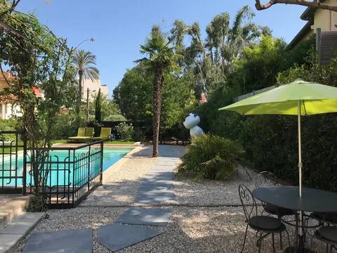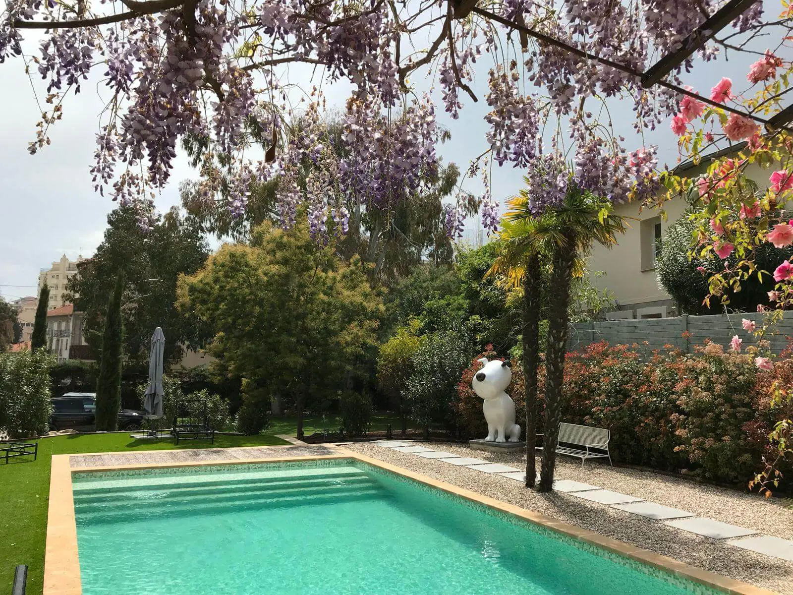 En extérieur, vous pourrez vous détendre au coeur d’un jardin méditerranéen de 1000m2; terrasse ombragée par une glycine, palmiers, mimosa, acacias…